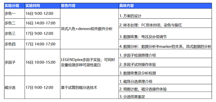 *注:請(qǐng)注意多色一、二、三、四為同一實(shí)驗(yàn),請(qǐng)根據(jù)自己的時(shí)間報(bào)名,請(qǐng)勿重復(fù)報(bào)名。上機(jī)實(shí)訓(xùn)多色實(shí)驗(yàn)擬招40人,多因子實(shí)驗(yàn)與磁分選實(shí)驗(yàn)分別擬招10人。