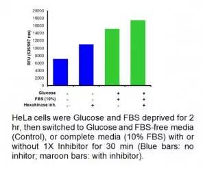 BioVision EZCellTM Glucose Uptake Assay kit 是一種簡單而超級靈敏、易用的葡萄糖攝取檢測試劑盒。試劑盒利用一種特殊的己糖激酶抑制劑抑制己糖激酶,己糖激酶是糖代謝過程中涉及到的第一個酶,在葡萄糖被細胞攝取后,可捕獲葡萄糖。 葡萄糖攝取是利用一系列酶反應檢測的,被氧化的葡萄糖產生的中間產物可以與OxiRed?探針反應而發(fā)出熒光信號(Ex/Em=535/587 nm) 。熒光信號量直接反應細胞所攝取和積累的葡萄糖。不像其他試劑盒是直接檢測葡萄糖衍生物,BioVision 提供了一種直接而強大的葡萄糖研究工具,可用于篩選和表征葡萄糖攝取相關疾病的藥物。