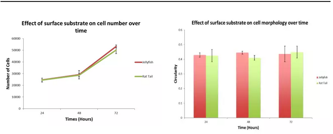 細胞培養(yǎng)72h結(jié)果顯示,在水母膠原(紅)上生長的細胞與在大鼠尾膠原(綠)上生長的細胞,細胞增殖水平和細胞形態(tài)接近。Jellagen是哺乳動物膠原蛋白良好的替代物。
