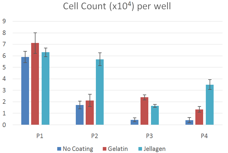 Jellagen膠原蛋白不僅具有良好的細胞兼容性、細胞粘附性,還可以為細胞提供充分的營養(yǎng)。在基質(zhì)支持軟骨細胞生長過程中,Jellagen膠原上生長的軟骨細胞同在牛明膠上生長的軟骨細胞比較,細胞在P4時存活率更高。