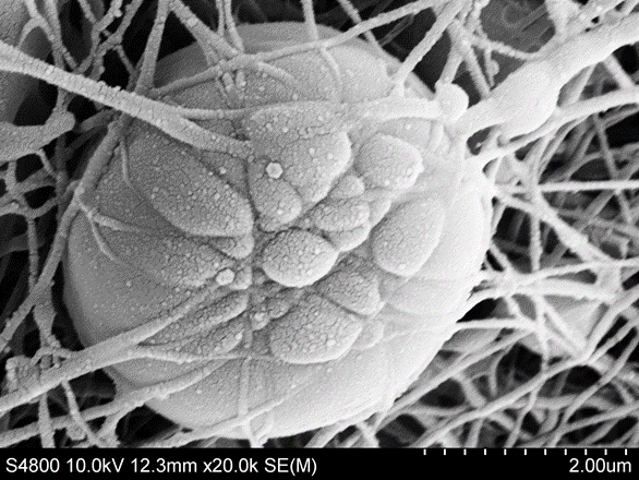 水母膠原蛋白經(jīng)靜電紡絲技術(shù)生產(chǎn)出的納米纖維墊,軟骨細胞嵌入100nm-200nm纖維叢中。該纖維與天然細胞外基質(zhì)(ECM)相當(dāng),表明Jellagen膠原蛋白納米纖維提供了細胞生長理想的環(huán)境。