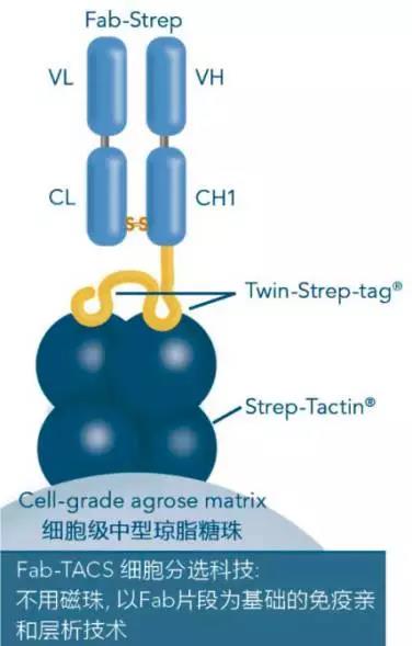 以Fab片段為基礎(chǔ)的無(wú)痕親和細(xì)胞分選技術(shù)(traceless affinity cell selection, Fab-TACS),由IBA Lifesciences根據(jù)其獨(dú)家的Strep-tag?/Strep-Tactin?蛋白純化系統(tǒng)發(fā)展而來(lái)。Fab-TACS運(yùn)用免疫親和層析的原理,利用細(xì)胞表面抗原分子CD marker與Fab片段的特異性結(jié)合來(lái)進(jìn)行捕捉及釋放目標(biāo)細(xì)胞。以不具磁性且可逆的試劑,取代一般具高親和力的完整抗體, 直接由全血或其他血液樣本來(lái)進(jìn)行溫和的標(biāo)準(zhǔn)化分選,因此能精準(zhǔn)的提供您不含標(biāo)記、未被活化的目標(biāo)細(xì)胞。