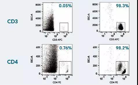 使用Fab-TACS細(xì)胞分選重力柱分離全血中的CD3+及CD4+免疫細(xì)胞。細(xì)胞樣本以CD3-APC (OKT-3)或 CD4-PE (OKT-4) 抗體染色后,進(jìn)行流式分析,左右分別為分選前后的細(xì)胞群分布。死細(xì)胞以DAPI染色先行排除,并使用不同F(xiàn)SC/SSC信號(hào)來(lái)排除雙粘體和細(xì)胞碎片。結(jié)果顯示:即使直接處理全血,F(xiàn)ab-TACS科技仍能分離出高純度目標(biāo)細(xì)胞。