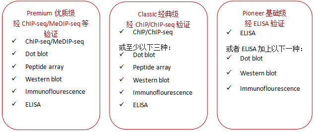 自2004年以來,Diagenode就與領(lǐng)先的表觀遺傳學(xué)專家和表觀遺傳學(xué)聯(lián)盟合作生產(chǎn)、驗證包括抗體在內(nèi)的表觀遺傳學(xué)試劑。2012年,Diagenode用一種創(chuàng)新、嚴(yán)謹(jǐn)?shù)目贵w分類系統(tǒng)改革了免疫沉淀技術(shù),用于表觀遺傳學(xué)研究。根據(jù)驗證水平將抗體分為三個不同級別,以幫助您建立選擇抗體的信心。最終,用您信任的抗體獲得滿意的結(jié)果。