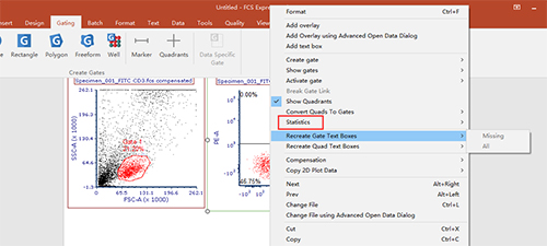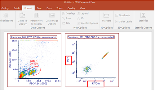 圈中目的細胞群,拖至空白處形成一個新的圖形,并根據需要改動橫縱坐標軸的參數。本示例中以FITC和PE為例,調節(jié)此兩通道之間的補償。下圖所示,補償未經過調節(jié),FITC與PE之間有補償。