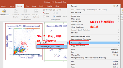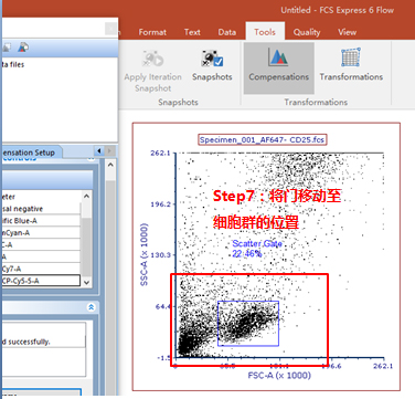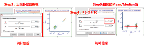 此時可以手動調節(jié)兩通道之間的補償,該數據為FITC單管,可用PE-FITC調節(jié)FITC滲漏到PE通道去的熒光。步驟如下圖所示: