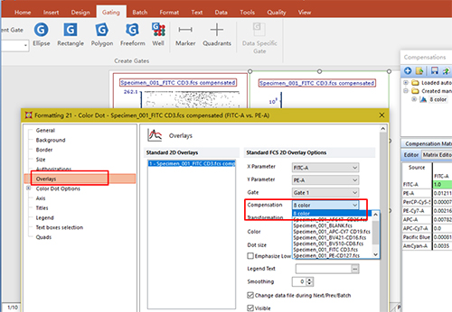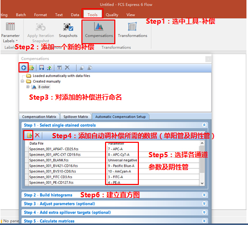 依次調整好各單管Control的Marker門的位置。此處不一一列舉?;氐窖a償界面。此處的3、4適用于使用補償beads調節(jié)補償的情況(由于本次數據為細胞,此處不詳細列出,如對此步驟感興趣,可咨詢小達君)