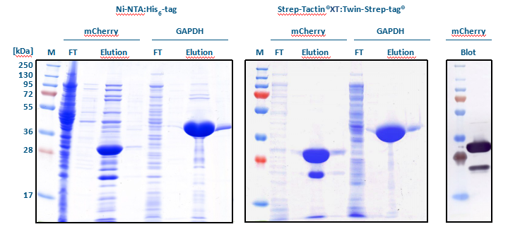 以SDS-PAGE分析發(fā)現(xiàn),不管是mCherry或是GAPDH,使用Strep-tactin? XT: Twin-Strep-tag?都能得到純度較高的目標(biāo)蛋白(見Elution)。Western Blot分析結(jié)果顯示,提取mCherry所出現(xiàn)的雜質(zhì)為其降解產(chǎn)物。