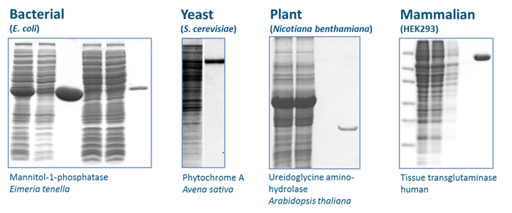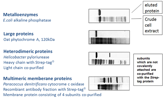 因His-tag系統(tǒng)使用Ni離子,所以在純化金屬蛋白(多數(shù)為酶)時(shí),可能會(huì)受到金屬間交互作用的干擾。而使用Strep-tag? 則不會(huì)出現(xiàn)此問題,因?yàn)镾trep-Tactin? XT與Strep-tag?的特異性結(jié)合不受金屬離子影響。且因其溫和的純化流程,所以還能用于純化大型蛋白、多亞基的蛋白復(fù)合體或是跨膜蛋白,并且保持蛋白功能。以Strep-tag?系統(tǒng)純化出不同的蛋白實(shí)例如下:
