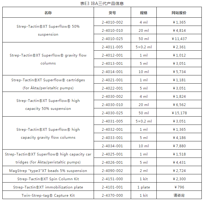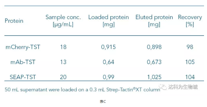 因Strep-Tactin?XT與Twin-Strep-tag蛋白的高親和力,即使目標(biāo)蛋白的濃度低,使用Strep-Tactin?XT仍可以有效的捕捉上清中的目標(biāo)蛋白。表C整理了幾個實驗的數(shù)據(jù),顯示當(dāng)目標(biāo)蛋白濃度低于20μg/ml時,得率仍能達(dá)到幾近100%。