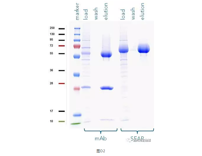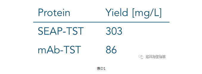 除了上述實驗所用的CHO細(xì)胞株外(中國倉鼠卵巢細(xì)胞),另一常用于生產(chǎn)蛋白的哺乳動物細(xì)胞株為HEK293(人胚胎腎細(xì)胞),使用上較CHO簡單。我們測試了Strep-Tactin?XT的純化表現(xiàn):表D1為以Expi293表達(dá)SEAP-TST或mAb-TST蛋白后,目標(biāo)蛋白的濃度。圖D2為純化表現(xiàn)的SDS-PAGE分析。從中可知,與ExpiCHO培養(yǎng)基相同,直接將表達(dá)好的Expi293上清加入1ml Strep-Tactin?XT高載量重力柱中進(jìn)行純化,一樣能夠快速的得到高純度的目標(biāo)蛋白。
