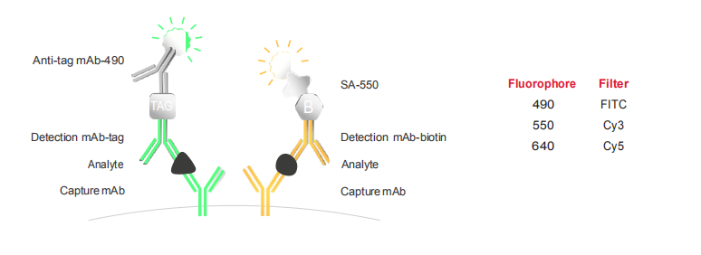 FluoroSpot能夠分析抗原特異性的多功能T細(xì)胞,例如,IFN-γ和IL-2的分析。三明治夾心結(jié)構(gòu)在熒光斑點(diǎn)中得以應(yīng)用,不同特異性的單克隆捕獲抗體混合物被包被于96孔板的PVDF膜上,生物素標(biāo)記的檢測抗體識別一種分泌物,tag標(biāo)記的檢測抗體識別其它的分泌物來實(shí)現(xiàn)雙色或三色細(xì)胞因子分泌細(xì)胞的檢測。檢測通過帶有特定熒光基團(tuán)的共軛試劑放大信號斑點(diǎn),可用自動讀板器進(jìn)行分析。