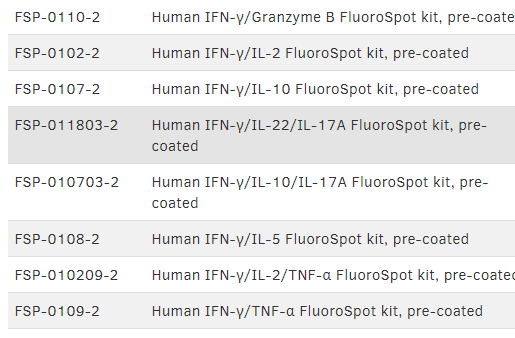 通過分泌單,雙和三色細(xì)胞因子分析劃分功能性T細(xì)胞亞群在許多不同的研究領(lǐng)域均引起極大的興趣。FluoroSpot可用于疫苗開發(fā),主要用于檢測和分析疫苗特異性免疫應(yīng)答。在癌癥研究中,F(xiàn)luoroSpot可用于,例如監(jiān)測腫瘤浸潤淋巴細(xì)胞或通過同時分析IFN-γ和顆粒酶B的分泌,以提供細(xì)胞毒性T細(xì)胞反應(yīng)更直接的評估。Mabtech公司提供了各種不同的熒光斑點(diǎn)試劑盒用于單,雙和三色分析物的T細(xì)胞的分析,其中IFN-γ可單獨(dú)分析或與幾個不同的分析物同時進(jìn)行分析。