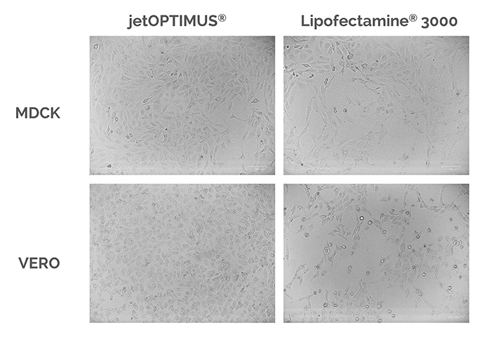 △圖2. 使用jetOPTIMUS?轉(zhuǎn)染24小時后,細(xì)胞仍然健康并保持良好形態(tài)。根據(jù)L3K和jetOPTIMUS?說明書要求進行轉(zhuǎn)染,24小時后在相差顯微鏡下觀察MDCK和VERO細(xì)胞的狀態(tài)。
