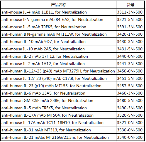 Mabtech除了ELISpot、ELISA相關(guān)檢測產(chǎn)品外,還提供人、小鼠等多種指標(biāo)的中和抗體;并且Mabtech的中和抗體均為單克隆抗體,不含疊氮化鈉,且內(nèi)毒素含量均低10 EU/mg。