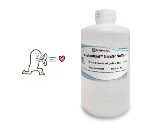 當(dāng)然蛋白電泳只是WB實驗的第一步,那還有什么方法能加快后續(xù)實驗(如轉(zhuǎn)膜)進程呢?別急,今天就給大家介紹一款來自分子產(chǎn)品專家Expedeon公司的快速轉(zhuǎn)膜液——InstantBlot?Transfer Buffer(貨號:NXB87500),作為Expedeon的一款專利產(chǎn)品,該轉(zhuǎn)膜液能夠大幅提升蛋白從“膠”至“膜”的轉(zhuǎn)移速度,最快只需10 min即可完成轉(zhuǎn)膜,并且不會產(chǎn)生過多的熱量,避免影響蛋白的后續(xù)檢測。