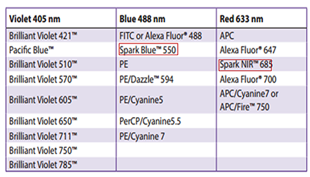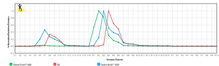 Spark Blue?550被488nm藍色激光激發(fā)并在550nm處發(fā)射,介于AlexaFluor?488或FITC和PE的峰值發(fā)射之間。SparkBlue?550的亮度與FITC相當。405nm紫外激光可以進一步增加這幾種熒光不互相混合的情況。