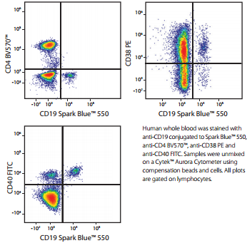 使用抗CD19-Spark Blue?550與CD4-BV570?、CD38-PE以及CD40-FITC等不同組合抗體對人全血進行染色。圖中數據均來至于淋巴細胞門。結果可以看出SparkBlue?550可以完全與FITC和PE熒光區(qū)別開,該數據使用Cytek?Aurora流式儀檢測。