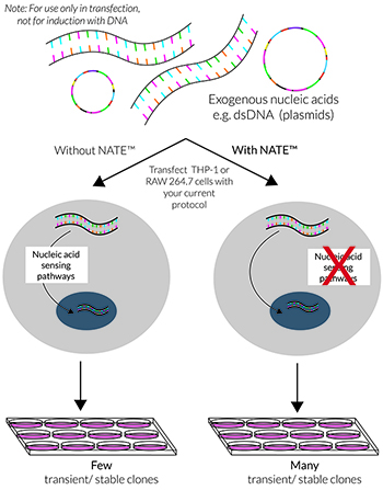在真核細(xì)胞轉(zhuǎn)染期間,外源核酸(如質(zhì)粒DNA)的主要障礙是它們會被胞質(zhì)傳感器檢測,如cGAS/STING,AIM2炎癥小體和LC3介導(dǎo)的自噬。這些防御性級聯(lián)信號的激活通常會導(dǎo)致低轉(zhuǎn)染效率、降低的細(xì)胞活力和不一致的結(jié)果,尤其是在難轉(zhuǎn)細(xì)胞(如免疫細(xì)胞)的轉(zhuǎn)染實驗中。NATE?抑制許多核酸感應(yīng)途徑,從而保護(hù)外源DNA并促進(jìn)其表達(dá)。