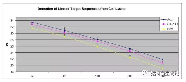 隨著HeLa細胞數(shù)的增加,分別用適量細胞裂解液裂解細胞后進行反轉(zhuǎn)錄,而后在7700 PCR儀上進行Actin、GAPDH和B2M基因的3復孔qPCR反應。