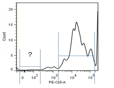 補償調節(jié)抗體的正確選擇對于熒光通道之間的補償調節(jié)是非常重要的。要求選擇的抗體所結合的抗原分子在樣本細胞中有明確表達,占樣品細胞的10%以上,50%以下。如果陽性細胞比例太低,在陽性細胞區(qū)域無法形成明顯的細胞團,無法判斷調節(jié)是否合適。如陽性細胞比例過高,則不表達該抗原的陰性細胞無法形成明顯的細胞團,如圖1-4直方圖所示。