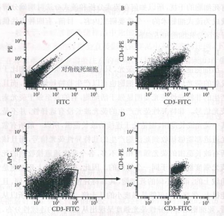 雖然死細胞位于散點圖的對角線上,但是對角線上的細胞確不一定是死細胞,因為雙陽性細胞如果在x軸和y軸的熒光信號相似時,也可以位于對角線上。所以,散點圖對角線上的細胞可能是死細胞,也可能是雙陽性細胞。如圖1-B所示,樣本細胞為正常小鼠脾臟細胞,標記 FITC-抗CD3抗體和PE-抗CD4抗體,F(xiàn)ITC和PE雙陽性的CD4 T細胞和死細胞混在一起,無法區(qū)分。但是死細胞和雙陽性細胞的形狀是不一樣的,死細胞呈現(xiàn)連續(xù)的線型分布,而雙陽性細胞群呈現(xiàn)圓形的群體分布,因此,可以從對角線上的細胞群體的形狀大致判斷細胞的性質(zhì)。雖然不能根據(jù)熒光強度的強弱來區(qū)分該熒光信號是來自于死細胞的非特異性熒光還是來自熒光素產(chǎn)生的熒光,但是可以利用在散點圖上死細胞位于對角線的特點來區(qū)分死細胞和陽性活細胞。如圖1-C所示,x軸表示FITC通道(樣本細胞標記有FITC-抗CD3抗體),y軸表示APC通道(閑置通道),借用該散點圖可以明確區(qū)分圖1-B中無法區(qū)分的死細胞和雙陽性細胞。此時只需要將排除了死細胞后的CD3 T細胞設(shè)門,將門內(nèi)的細胞顯示于新的FITC-PE散點圖中,如圖1-D,此時該散點圖內(nèi)的細胞都是活細胞,因為樣本細胞同時標記有PE-抗CD4抗體,所以圖中的細胞明顯分為兩群,雙陽性的是CD4T細胞,單陽性的是CD8 T細胞。