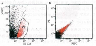 PE-Cy5通道(通常是FL3,接收的熒光波長范圍大致為655-685nm)有時可用于識別死細胞,但首先該通道必須是閑置的通道,及樣本細胞中沒有標記該通道代表的熒光素(PE-Cy5、PerCP等)偶聯(lián)抗體。選擇PE-Cy5-SSC散點圖,一般可看到不成群的PE-Cy5陽性細胞,這些陽性細胞的SSC值也是散在分布的,這些散在的PE-Cy5通道非標記陽性細胞,即圖2-A中的紅色部分,將這部分細胞設(shè)門顯示于FITC-PE散點圖中,如圖2-B所示,這部分PE-Cy5通道非標記陽性細胞基本都位于對角線部分,而對角線細胞一般為死細胞,所以散在的PE-Cy5通道非標記陽性細胞一般就是死細胞。