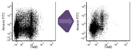 圖為:體外培養(yǎng)一天的C57BL/6小鼠脾細胞做Annexin V/7-AAD染色的流式數(shù)據(jù)。其中,左邊為未經(jīng)固定處理的細胞上機檢測結(jié)果; 右邊為經(jīng)過70%EtOH, 1.5%PFA固定處理的細胞上機檢測結(jié)果。
