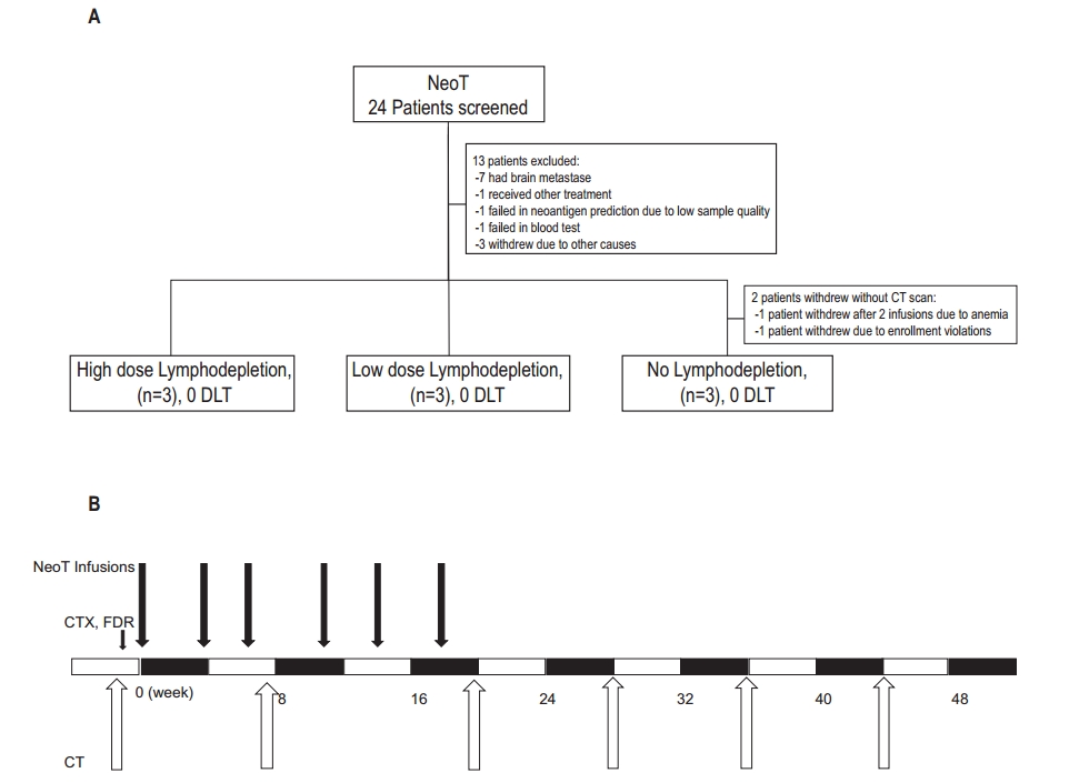 針對(duì)這些問(wèn)題,中山大學(xué)徐瑞華團(tuán)隊(duì)在2023610日發(fā)表了題為“A pilot study of lymphodepletion intensity for peripheral blood mononuclear cell-derived neoantigen-specific CD8+ T cell therapy in patients with advanced solid tumors”的研究論文。該研究開(kāi)發(fā)了一種從癌癥患者的外周血單個(gè)核細(xì)胞(PBMCs)中產(chǎn)生個(gè)性化Neo-T(新抗原特異性CD8+ T細(xì)胞)的方法。作者建立了一個(gè)流程,包括通過(guò)生物信息學(xué)分析預(yù)測(cè)新抗原,并在25天內(nèi)大規(guī)模擴(kuò)增新抗原特異性T細(xì)胞。為了評(píng)估Neo-T治療的臨床療效并確定Neo-T治療的最佳淋巴細(xì)胞耗竭強(qiáng)度,作者進(jìn)行了一項(xiàng)首次在人體中使用氟達(dá)拉濱和環(huán)磷酰胺增加劑量的Neo-T治療的研究。該研究是一項(xiàng)開(kāi)放標(biāo)簽I期臨床試驗(yàn)(NCT02959905),包括標(biāo)準(zhǔn)治療難治的局部晚期或轉(zhuǎn)移性實(shí)體瘤患者。