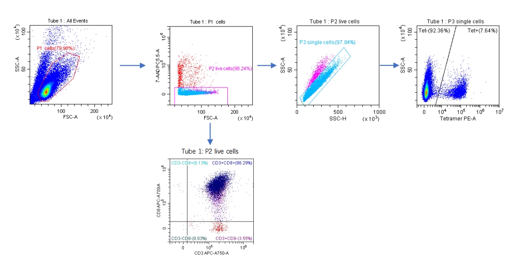 5、使用流式細(xì)胞儀對(duì)細(xì)胞進(jìn)行分析,基于DAPI對(duì)活細(xì)胞圈門(mén),并對(duì)“CD8+ pMHC -四聚體+細(xì)胞進(jìn)行分類;