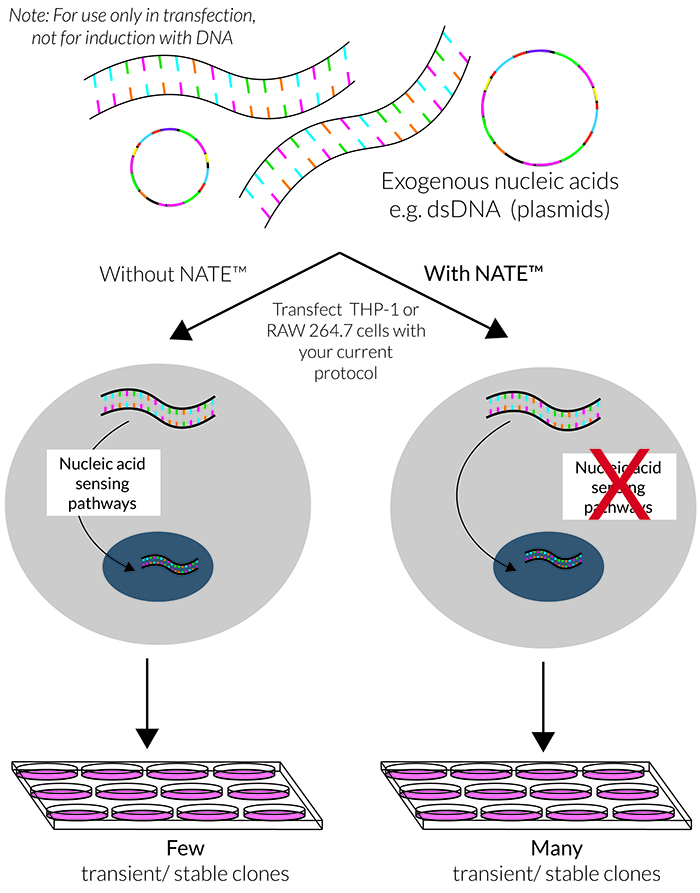在真核細胞轉(zhuǎn)染期間,外源核酸(如質(zhì)粒DNA)的主要障礙是它們會被胞質(zhì)傳感器檢測,如cGAS/STING,AIM2炎癥小體和LC3介導(dǎo)的自噬。這些防御性級聯(lián)信號的激活通常會導(dǎo)致低轉(zhuǎn)染效率、降低的細胞活力和不一致的結(jié)果,尤其是在難轉(zhuǎn)細胞(如免疫細胞)的轉(zhuǎn)染實驗中。NATE?抑制許多核酸感應(yīng)途徑,從而保護外源DNA并促進其表達。