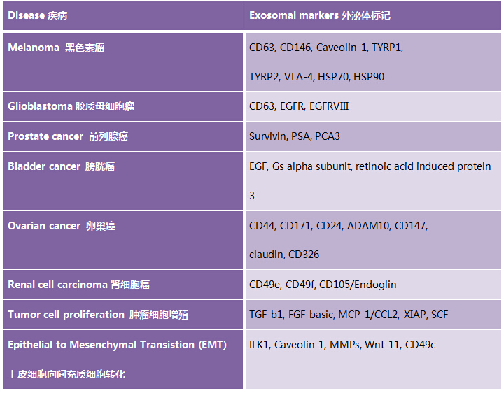 腫瘤細(xì)胞和它們的環(huán)境之間的直接作用之所以在腫瘤發(fā)展進(jìn)程中至關(guān)重要,其中重要的原因就是外泌體在細(xì)胞間信號(hào)傳遞中起關(guān)鍵作用。釋放到細(xì)胞外環(huán)境的外泌體可以促進(jìn)血管生成,腫瘤細(xì)胞增殖以及血栓形成,除此之外還有細(xì)胞外基質(zhì)的重塑。下面表格中列舉了常見腫瘤的一些外泌體標(biāo)記。