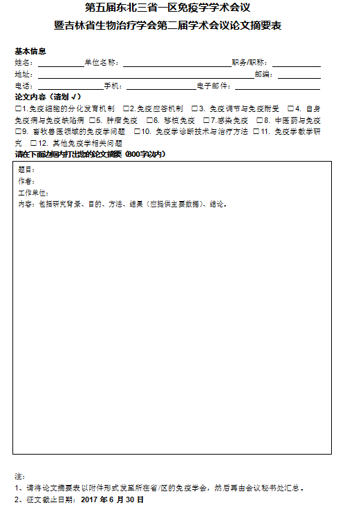 請于2017年6月30日前將“論文摘要表”發(fā)送至所在省/區(qū)的免疫學會,然后再由會議秘書處匯總。